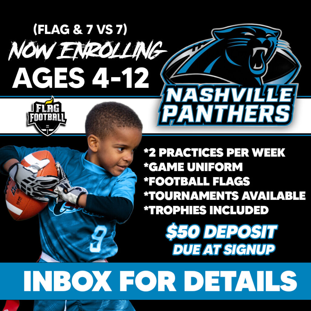 Community Calendar / Health and Wellness 25 Views December 30, 2025 0 Nashville Panthers Flag Football and 7vs7 Signups Share on FacebookPost on XFollow usSave